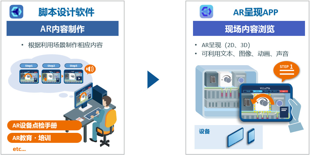 我們的產(chǎn)品由無(wú)需編程的腳本設計軟件(Story Designer)和可以在平板設備上播放和觀(guān)看內容的應用程序(Story Viewer)組成。使用現場(chǎng)業(yè)務(wù)數字化AR軟件,可以防止因錯誤操作設備、維保流程錯漏等導致的工作失誤,建立數字化作業(yè)履歷,為復雜技術(shù)的傳承和提高現場(chǎng)工作效率做出貢獻。