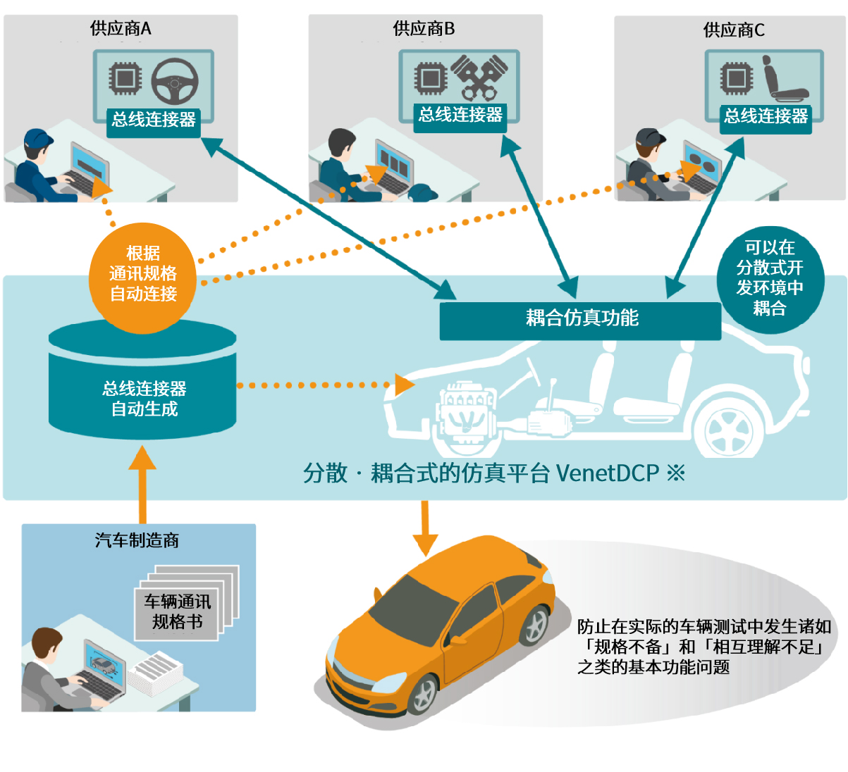 為了更廣泛適用于已在汽車(chē)制造商及供應商中普及推廣的基于模型的開(kāi)發(fā)方式,VenetDCP將大部分模型、不同開(kāi)發(fā)工具、不同企業(yè)聯(lián)系在一起,提供可以基于網(wǎng)絡(luò )平臺的協(xié)同驗證環(huán)境。這樣一來(lái),使用者便可以提前實(shí)施諸如自動(dòng)駕駛以及ADAS這種需要協(xié)同多個(gè)子系統,且車(chē)載環(huán)境驗證極為復雜的項目,實(shí)現品質(zhì)改善,大幅度提高生產(chǎn)效率。