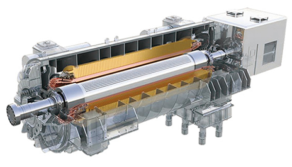 汽輪發(fā)電機是將通過(guò)汽輪機產(chǎn)生的機械能(轉動(dòng)動(dòng)能)轉化為電能的設備。為滿(mǎn)足社會(huì )需求,東芝不斷地進(jìn)行技術(shù)開(kāi)發(fā),為客戶(hù)提供從小到大的各種容量等級的產(chǎn)品。同時(shí),與以往相比,擴大了高效可靠的間接氫冷方式的應用范圍。此外,為滿(mǎn)足系統運行操作需求,我們正在努力提高系統的可操作性。