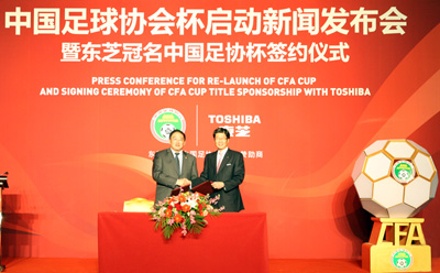企業(yè)新聞東芝獨家冠名2011年中國足協(xié)杯2011年-04月-08日株式會(huì )社東芝及東芝(中國)有限公司今天在北京與中國足協(xié)召開(kāi)新聞發(fā)布會(huì ),宣布東芝成為中國足球協(xié)會(huì )主辦的中國足協(xié)杯的獨家冠名贊助商,贊助時(shí)間為3年。株式會(huì )社東芝執行役常務(wù)中國總代表兼東芝(中國)有限公司董事長(cháng)?總裁田中孝明和中國足協(xié)副主席韋迪,現場(chǎng)共同宣布合作冠名,著(zhù)名組合羽泉作為特約嘉賓也出席了發(fā)布會(huì )。田中孝明總裁在講話(huà)中表示,“一直以來(lái),東芝在世界各地開(kāi)展經(jīng)營(yíng)事業(yè)的同時(shí)也大力支持當地的體育文化發(fā)展,特別與足球有很大的淵源。東芝作為官方贊助商贊助了2002年韓日世界杯足球賽、2006年德國世界杯足球賽,從2005年至今贊助AFC(亞洲足球聯(lián)合會(huì )),為各大賽事的成功做出了貢獻,因此,東芝對成為本次中國足協(xié)杯賽贊助伙伴感到十分自豪,同時(shí)希望通過(guò)對中國足協(xié)杯的贊助,為中國足球發(fā)展以及增強人民體質(zhì),促進(jìn)青少年的健康全面成長(cháng)作出貢獻”。 -