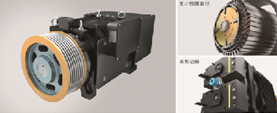 小型化的永磁同步電動(dòng)機、更節省空間;用電量減少30%以上(與傳統電動(dòng)機相比);無(wú)齒輪曳引式,無(wú)需齒輪油,實(shí)現低振動(dòng)低噪音,更為綠色環(huán)保;馬達采用集中卷線(xiàn)方式、體積更為小巧,具有高科技的領(lǐng)先水平。
