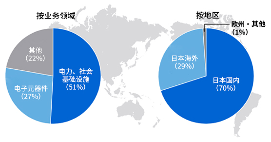 根據2022年度數據,按業(yè)務(wù)領(lǐng)域區分的采購比例(按金額)為:電力和社會(huì )基礎設施占51%,電子元器件占27%,其他占22%。按地區劃分,日本國內采購金額占比為70%,亞洲(含中國、印度)采購金額占比為29%,歐洲及其他地區為1%。