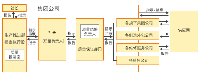 東芝集團質(zhì)量保證活動(dòng)的實(shí)施推進(jìn)體制是:由“生產(chǎn)推進(jìn)部擔當執行役”和“質(zhì)量推進(jìn)室”對集團進(jìn)行統一管理,由集團公司負責人對其公司每個(gè)產(chǎn)品、每項服務(wù)負責。從產(chǎn)品企劃、開(kāi)發(fā)、生產(chǎn)到廢棄、再資源化,在整個(gè)產(chǎn)品生命周期都注重提升產(chǎn)品質(zhì)量,由各主要的集團公司的“質(zhì)量統籌負責人”對所管轄的日本國內外事業(yè)所(制造基地)、供應商、維護服務(wù)公司、制造外包公司進(jìn)行指導與監督檢查。