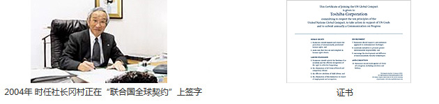 東芝集團于2004年1月,加入了聯(lián)合國倡導的“人權、勞務(wù)、環(huán)境”相關(guān)普遍原則“聯(lián)合國全球契約”?!奥?lián)合國全球契約”是聯(lián)合國秘書(shū)長(cháng)科菲安南(時(shí)任)在1999年的世界經(jīng)濟論壇年會(huì )(達沃斯論壇)上倡導的企業(yè)自愿行動(dòng)原則。認為企業(yè)在開(kāi)展業(yè)務(wù)時(shí),須遵守國際上公認的人權、勞務(wù)、環(huán)境、反貪污相關(guān)規范,不斷落實(shí)企業(yè)的社會(huì )性責任,推動(dòng)世界的可持續發(fā)展。
