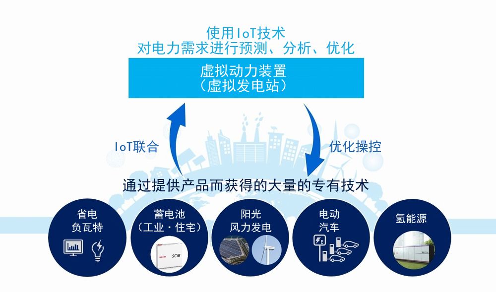 齊藤:東芝已經(jīng)在相關(guān)技術(shù)方面取得了較大進(jìn)展。其中之一便是“虛擬動(dòng)力裝置”。這是一種使用IoT技術(shù)將太陽(yáng)能、風(fēng)能、電動(dòng)汽車(chē)、蓄電池等分散的電力結合起來(lái),如同一個(gè)發(fā)電站一樣運轉的裝置。通過(guò)針對性措施,如在省電、負瓦特交易等方面靈活應用IoT和通過(guò)AI技術(shù)進(jìn)行分析與電力需求預測,控制各分散電源、消費者端的設備,與用戶(hù)共同建立相應機制,提供最佳的電力配給。